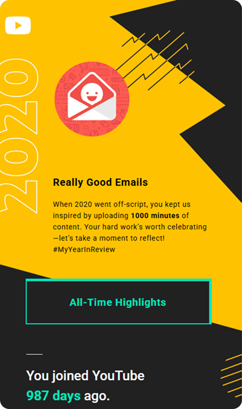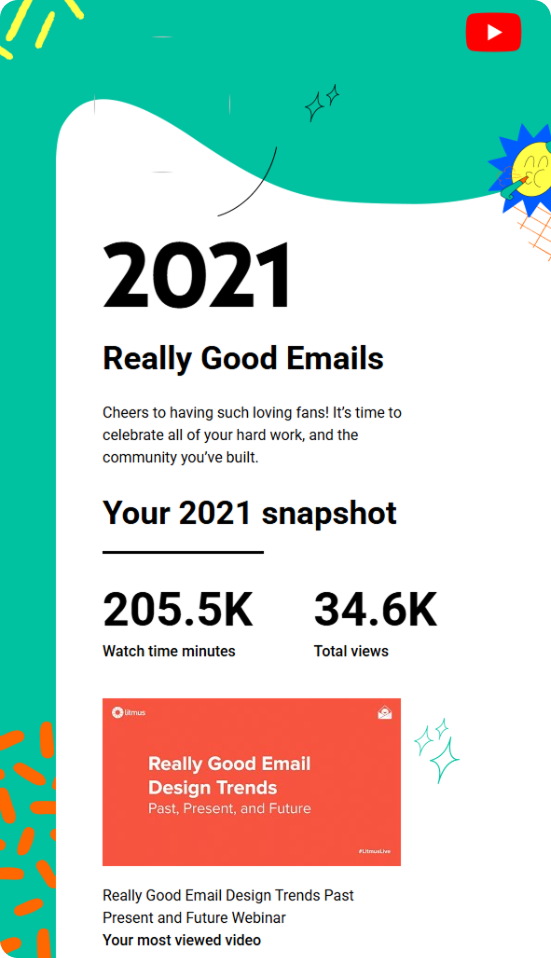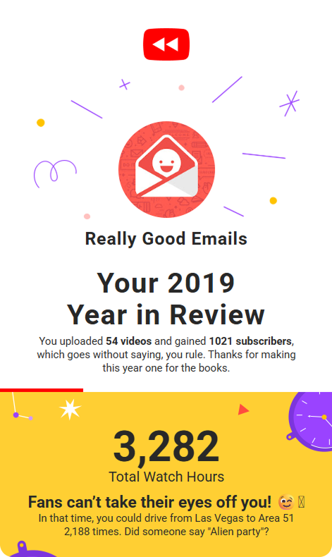Matt Helbig: Even just making a stock image go over that line a little bit really helps you transition to different parts of the email. That is a smart one. This last little section has those lifetime highlights. I think that is cool to see. It is interesting that they make this all about your channel, rather than the community or anything else. I haven't really seen a year wrap-up of what other creators are doing. I think that it is smart for them to focus on the individual channel. Perhaps it feels more personal to you. For email marketers who want to create a year-end email, do you have any tips on how to gather data to make it effective?